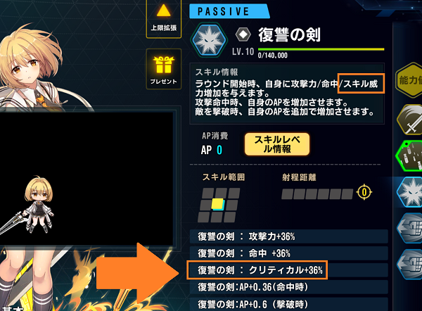 上の効果説明欄では[スキル威力]とありますが戦闘に出すと下の説明欄通り、実際はクリ率が増加します。