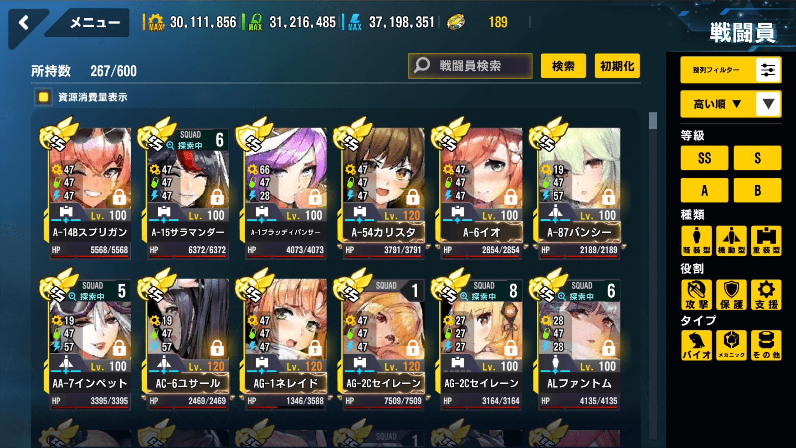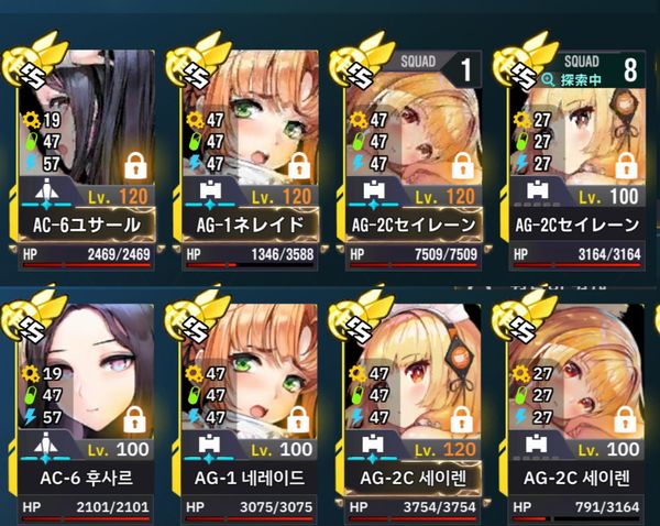 これは筆者の戦闘員画面で保護機のみソートした上段なんですが、上と下ではHPの値が大きく異なりますよね。