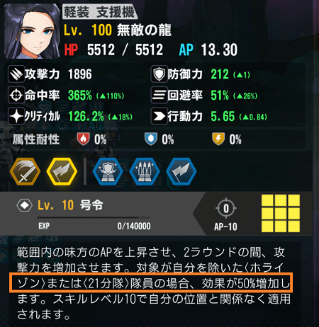無敵の龍のスキル2は、同時出撃している味方が<ホライゾン>または<21スクワッド>判定を持っている場合、スキル2の効果が1.5倍になるよう追加適用されます。