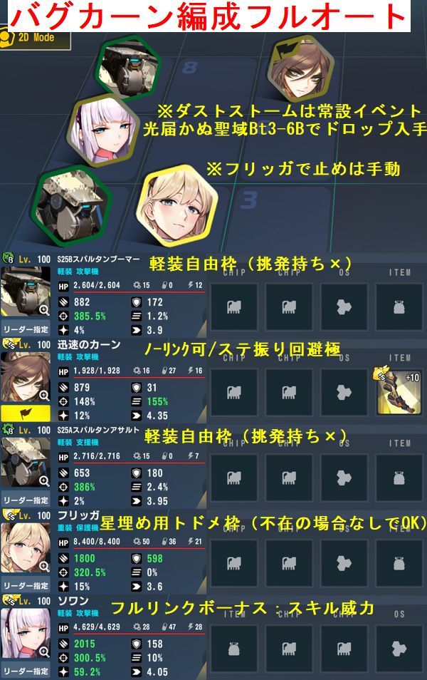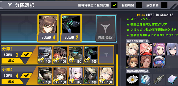 なおフリッガに関してはここEv2-3Exの初回クリア報酬ですから一度クリアしたら手に入りますし、星獲得用の編成制限の重装4以上も第2部隊に添えて2部隊で同時出撃することで育成の手間はスキップ可能です。