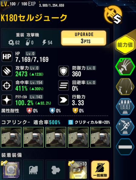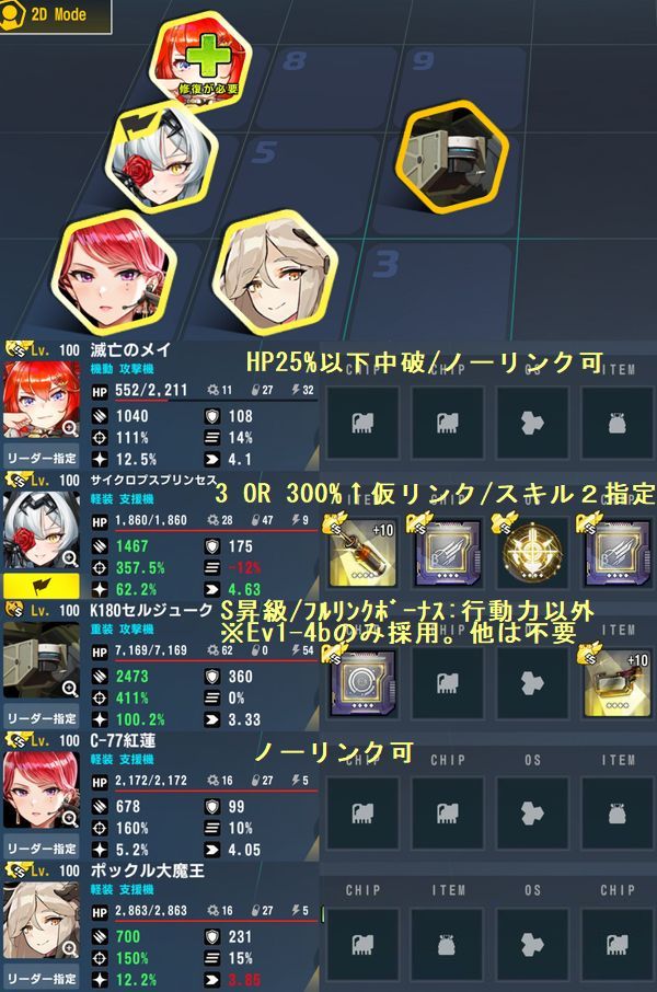 逆に言えばバフが本体ですので一人でもスキルレベル10以外だと火力が足りなくなったりで今回の攻略が失敗したりする可能性があるため、出撃前に念入りにパッシブ群のスキルレベルを確認してください。