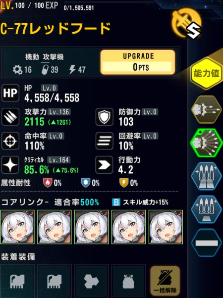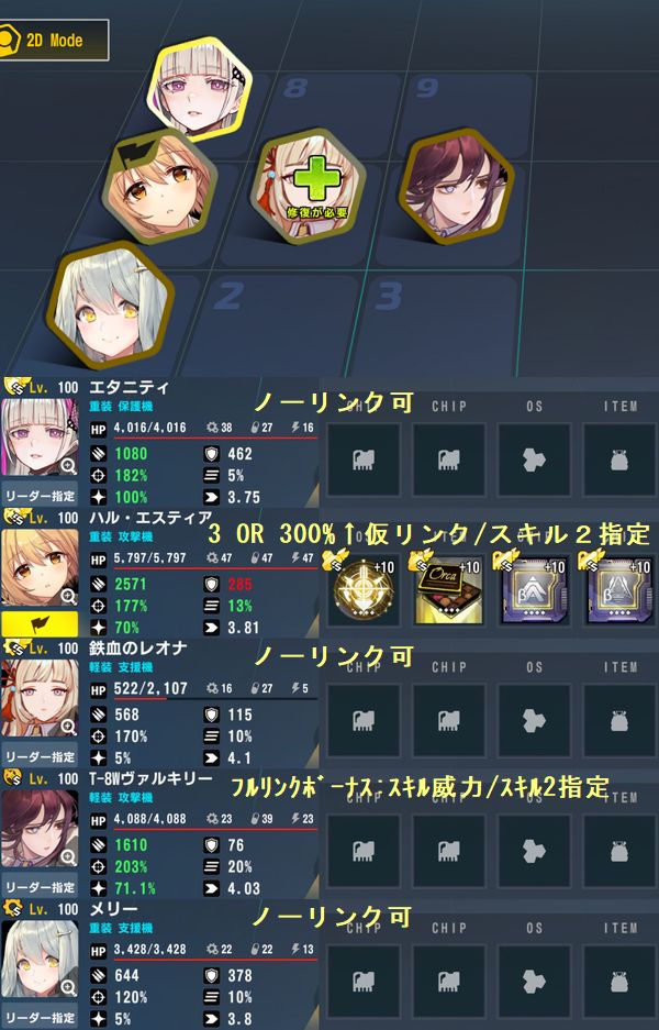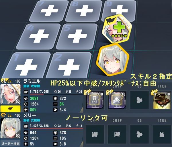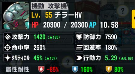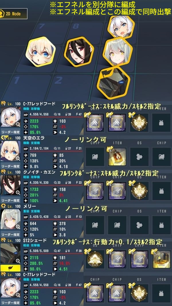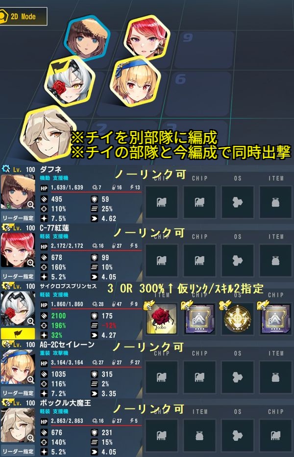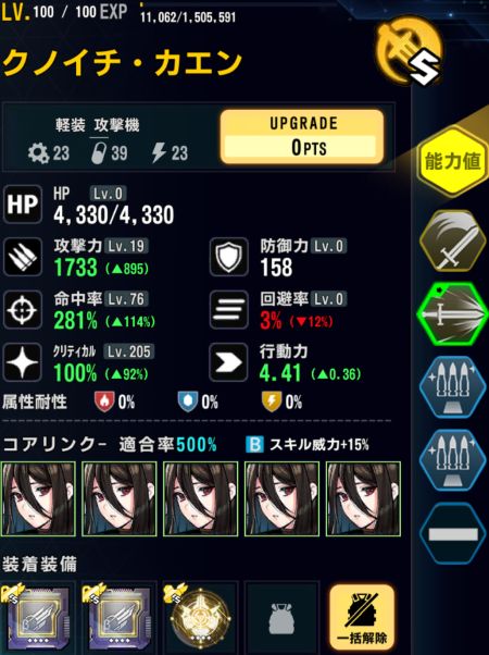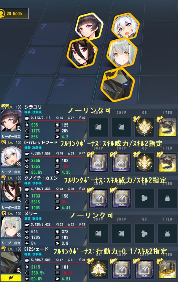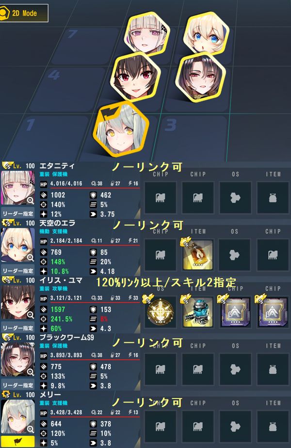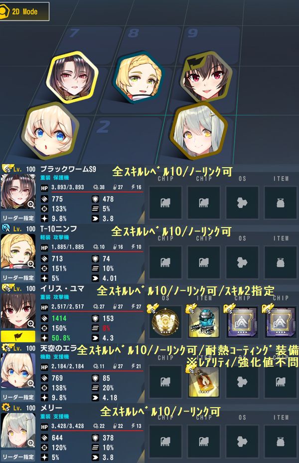 上の☆4/攻略の項目で記載した通り冷気編成は苦しい、物理だと防御貫通100%近くが欲しい、のでジェニーで交換できるハルちゃんを3リンクにするかその辺で拾ったS重装攻撃機を5体リンクして300%リンク相当にして9マス範囲攻撃を連打して壊滅させる作業。