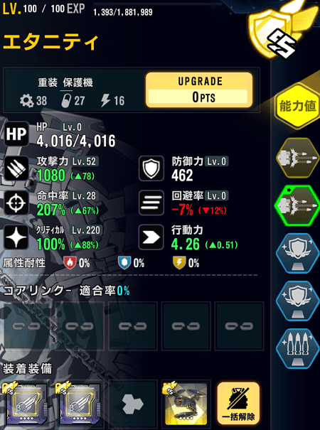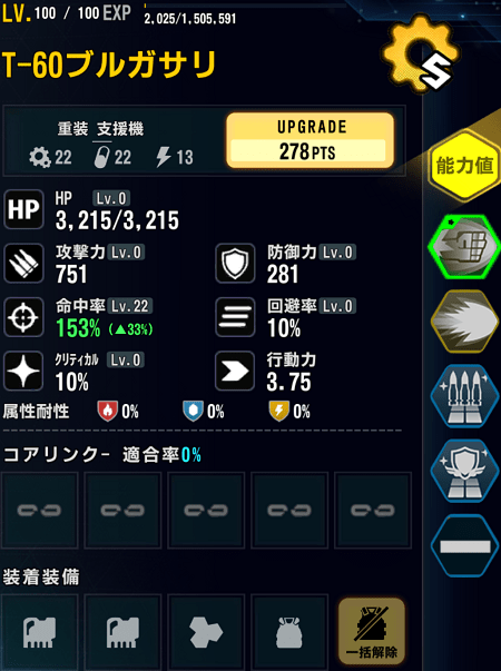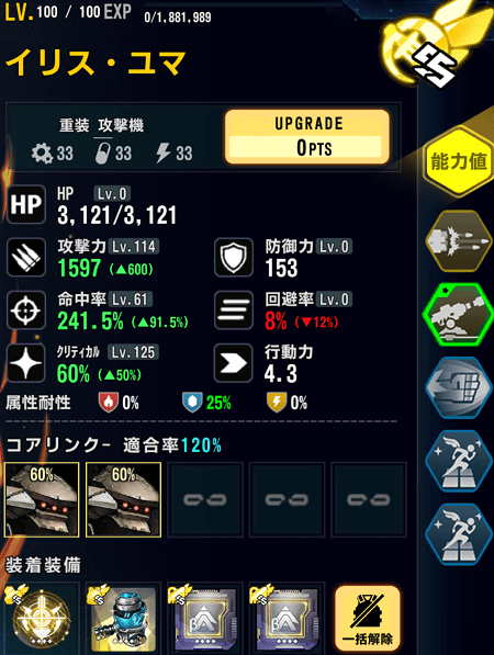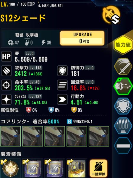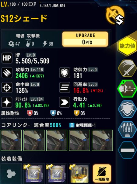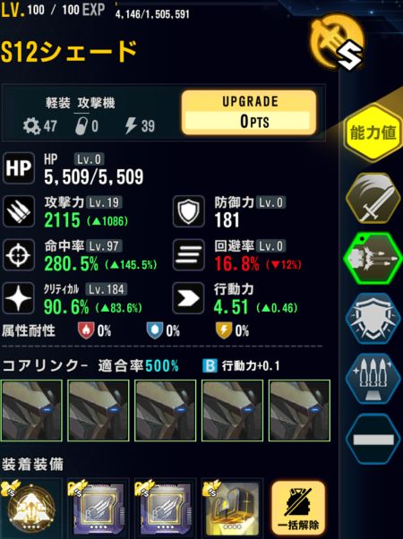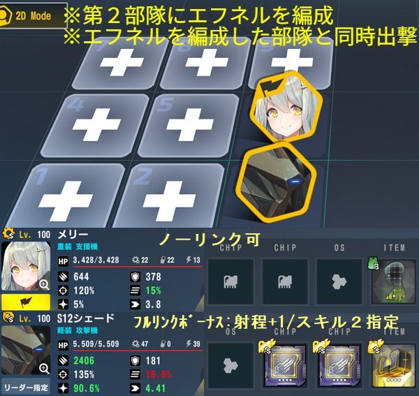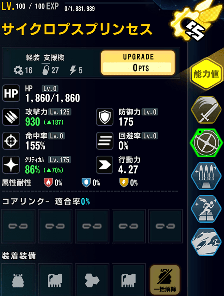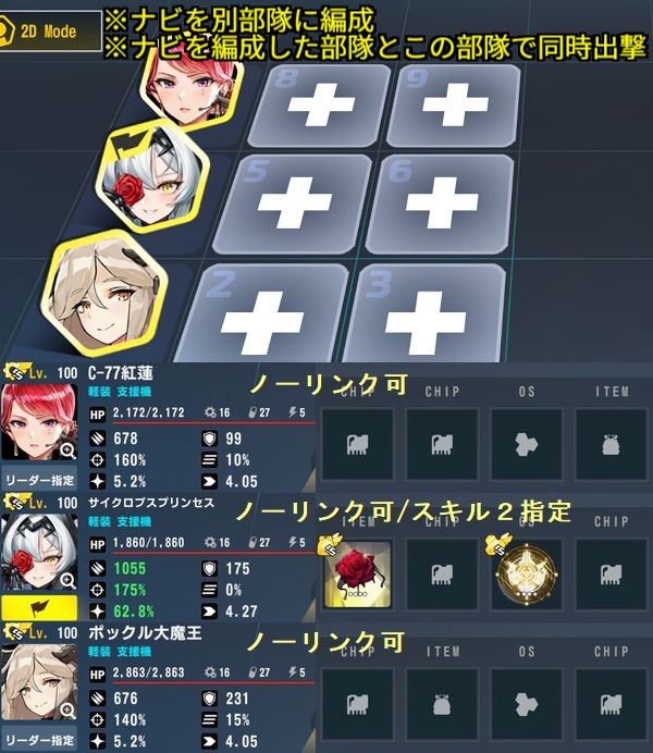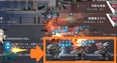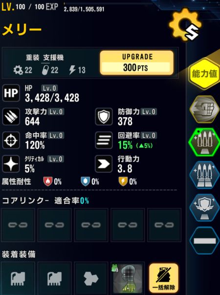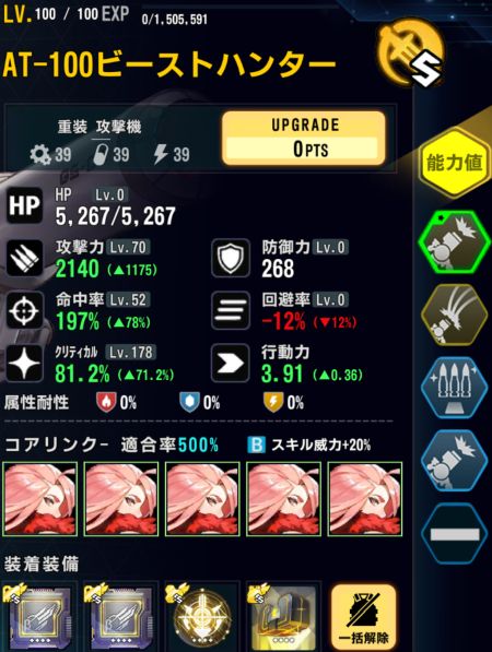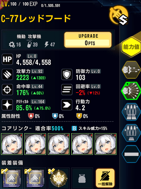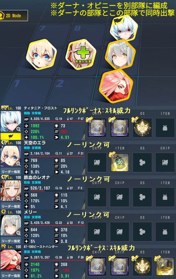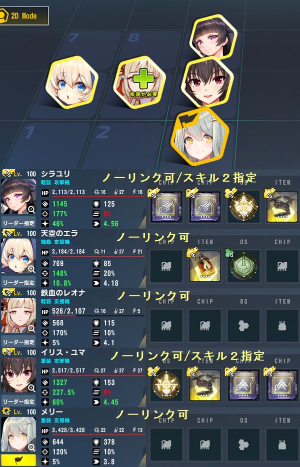 上の☆4/攻略の項目で記載した通り冷気編成は苦しい、物理だと防御貫通100%近くが欲しい、のでジェニーで交換できるハルちゃんを3リンクにするかその辺で拾ったS重装攻撃機を5体リンクして300%リンク相当にして9マス範囲攻撃を連打して壊滅させる作業。