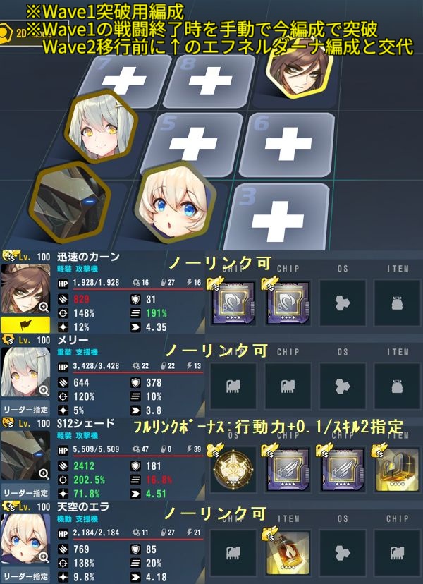 戦闘続行付与が鬱陶しいのでレモネードベータ編成の際軽装1時の強化不可を攻撃機に付与、によりWave1に攻撃機以外だけが残るようにしてしまえ編成。