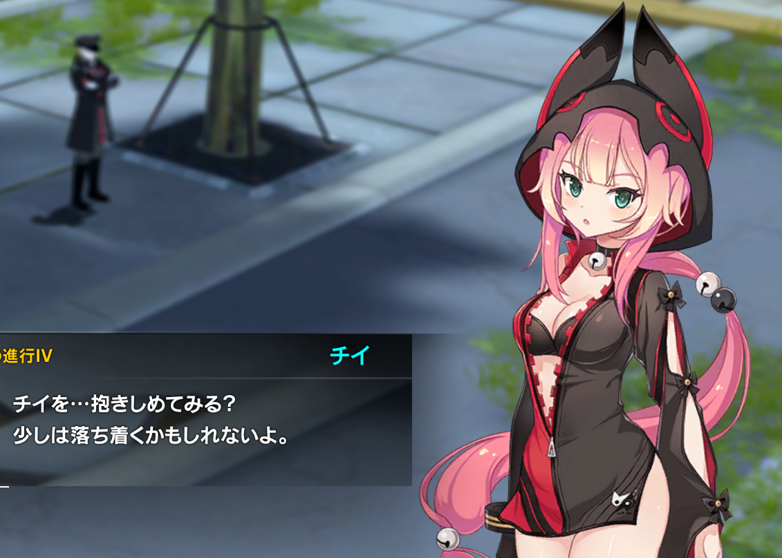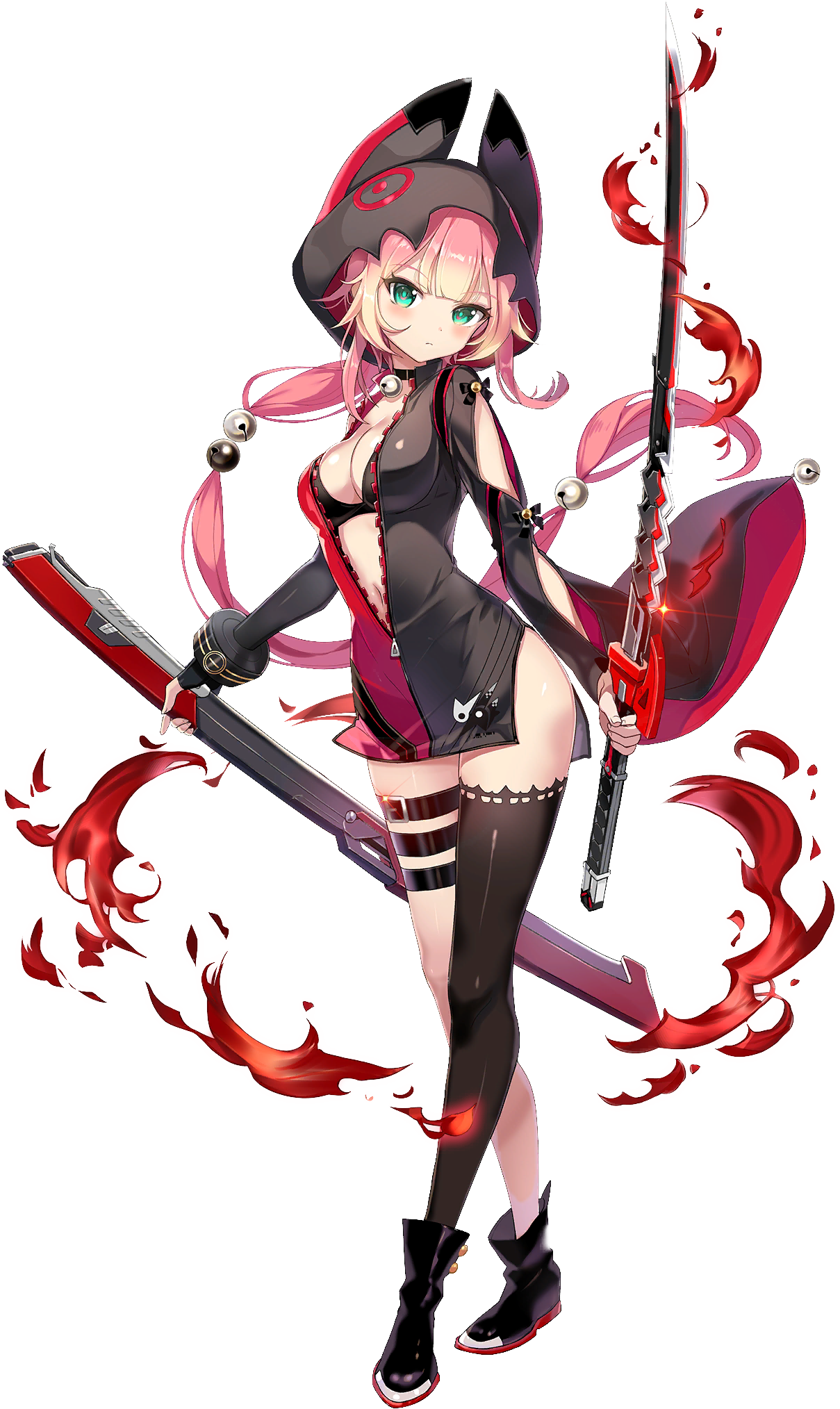 全体的に黒と赤、ピチっとした衣装ながら胸元や太もも、袖から先を出しているなど動きやすさを重視しつつもセクシーなデザイン、炎のエフェクトとカタナ、猫耳っぽいフードを被っている……と一見"主人公"というよりは悪役の幹部っぽいのに、顔立ちが幼すぎるのが訳ありっぽいとしか見えない少女、それがチイ・アルエルです。
