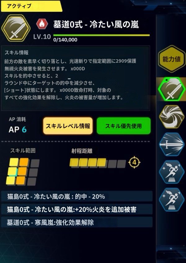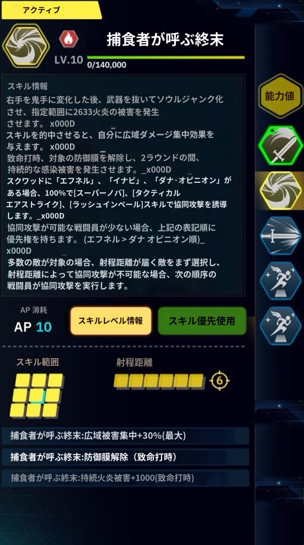 以下も上記の画像も本国版ラストオリジンの実機のものであり、育成完了済みのLv100フルリンクのスキルレベル10となっています。