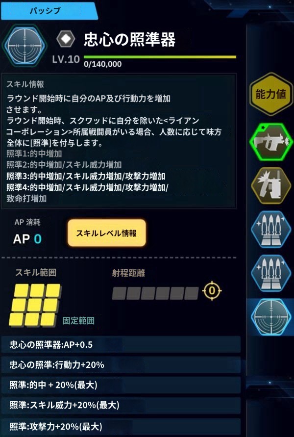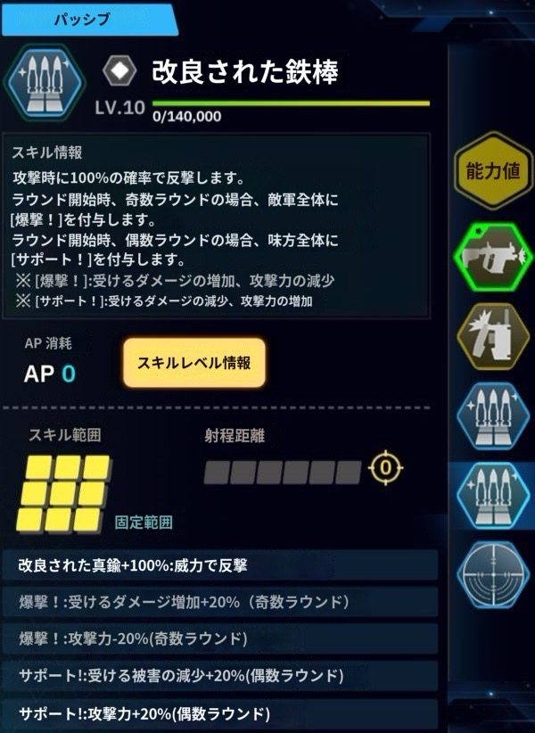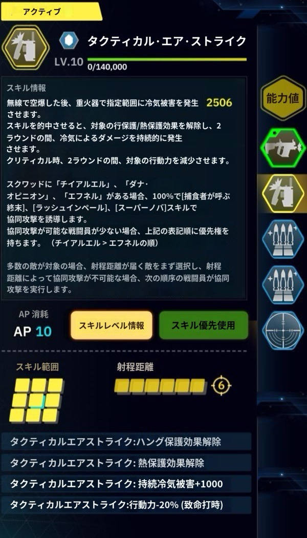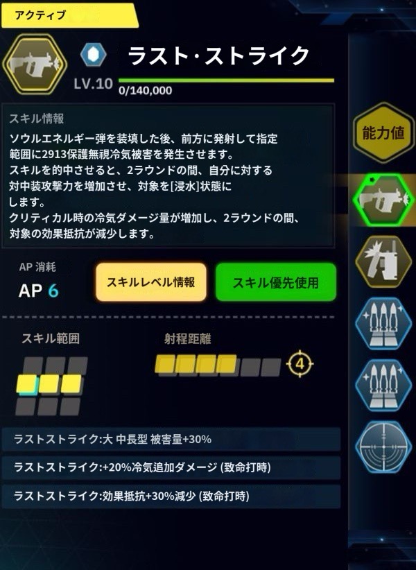 以下も上記の画像も本国版ラストオリジンの実機のものであり、上記は育成完了済みのLv100フルリンク、下のスキルはノーリンク時のスキルレベル10となっています。
