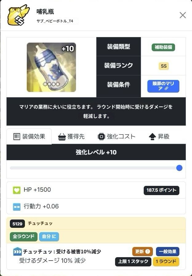 マリアのHPを大幅に稼ぎ、行動力も足し、被ダメ軽減も獲得できる複合効果の装備です。