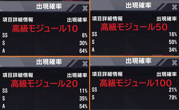 特殊制作では高級モジュールが最低値の10だと、純粋にAランクの排出率自体は64%と高めです。