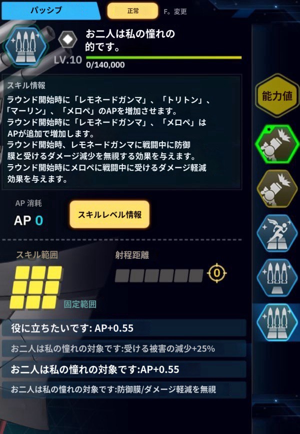 レモネードアルファで重装に超ブーストを、敵陣には遅延を打ち込みつつメリーとロデーでさらに行動力APの補助と、ガンマ自身のポセイドン隊員補正で攻撃バフを上乗せ。メローペにもガンマを強化してもらいつつ自己標的で引き付けてもらう……な構成です。
