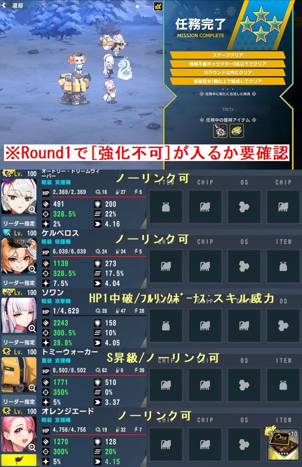これにより悠長に殴ってられますし、相手は[強化効果]しか持ってない(奇数Round開始時にデバフ解除や効果抵抗+50%獲得も持ってるもののこれも強化効果での起動)ので開幕1Round目でオレンジの[強化不可]を50%で通せたら後はフルオートでクリアできます。