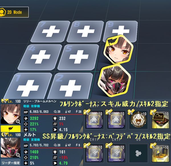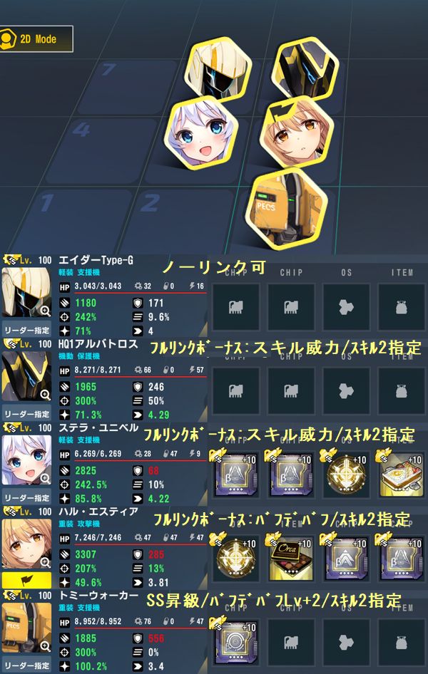 ハルのスキル2→ステラのスキル2の協同→スキル1の支援攻撃、と繋がった後にさらにステラ自身のスキル2が起動するように行動順を調整した編成です。