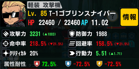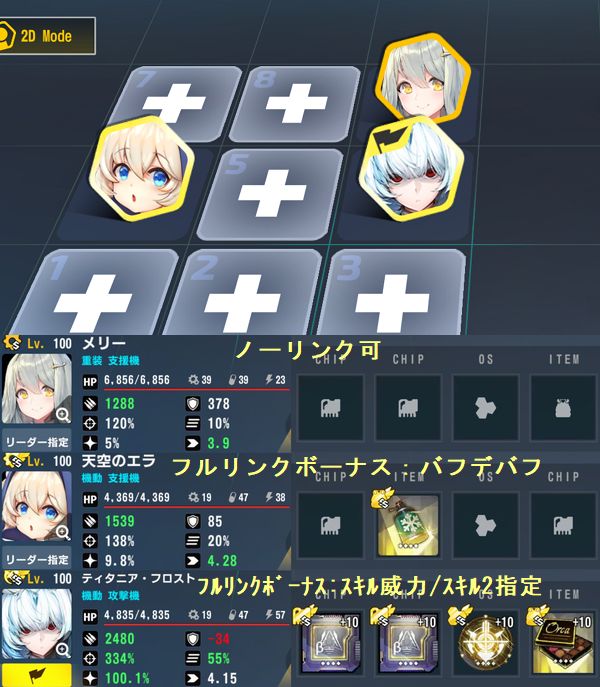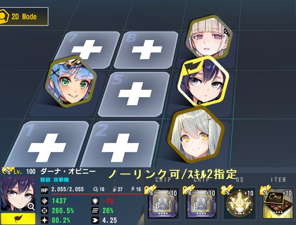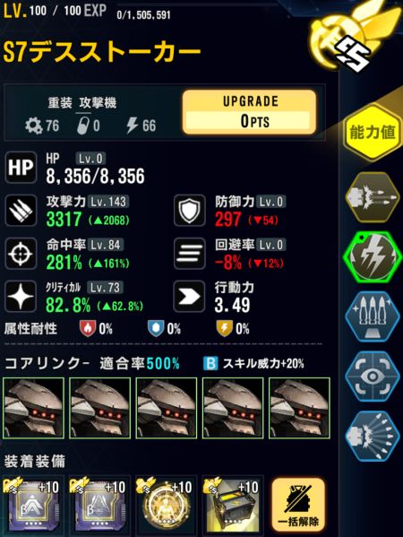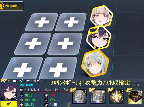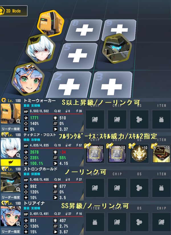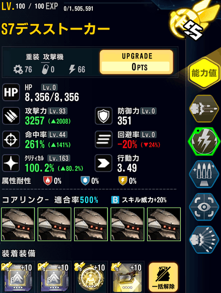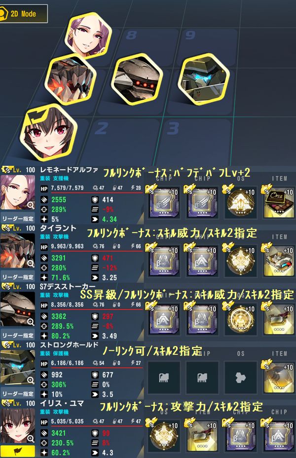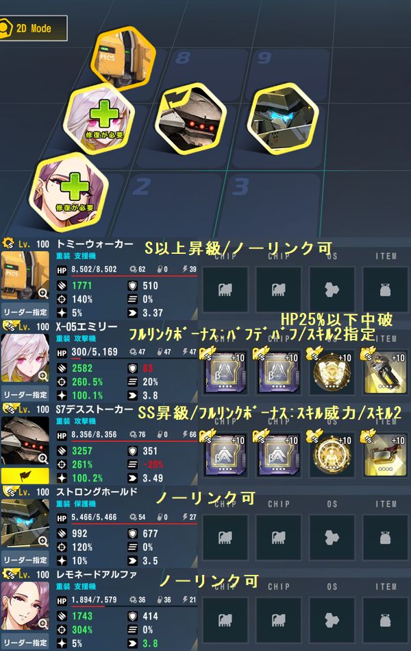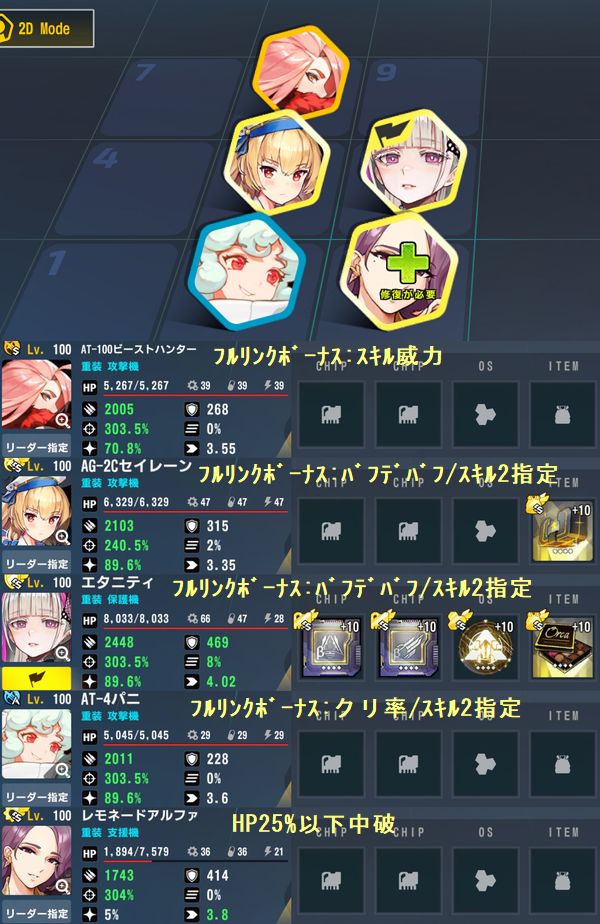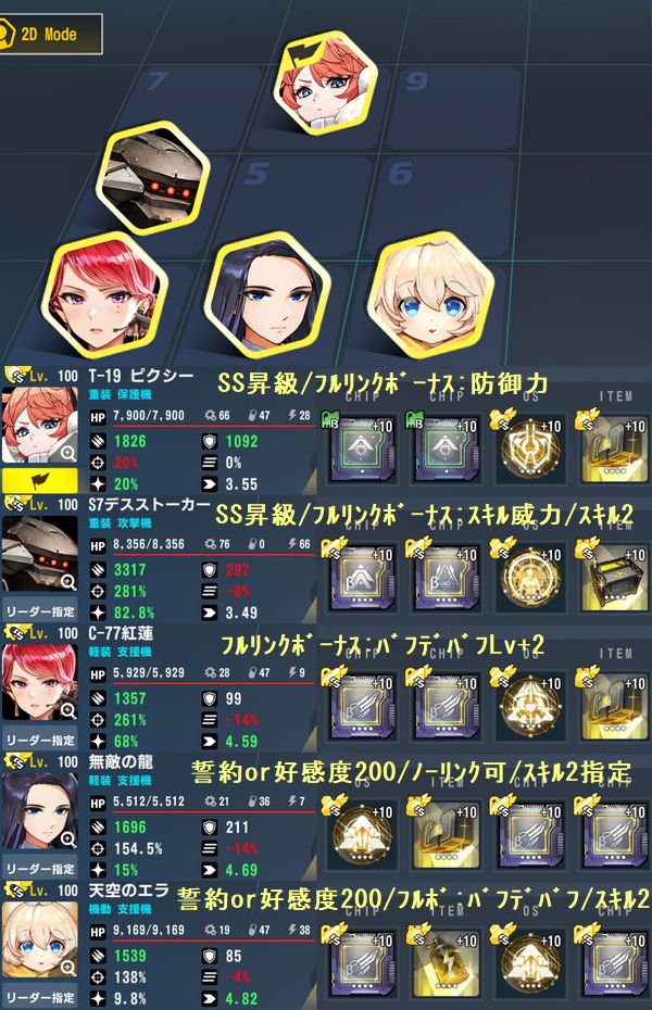 同じ横3マス攻撃持ちのデスストは重装攻撃機の時点で被ダメ軽減無視を付与できる装備"重装用火器照準器"を装備できるし……とこの3名を起点にサポーターを添えた構成となっています。