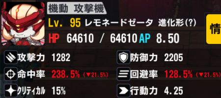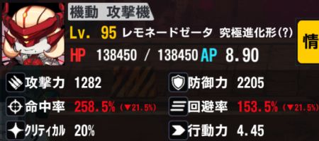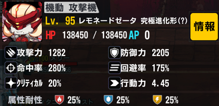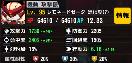 そして今回登場しているレモネードゼータはWave1の個体の開幕の被ダメ無効化10回以外は全部が[強化効果]と言うことが分かっているので、レモネードベータを連れて行って軽装1なら[強化不可]を付与可能です。