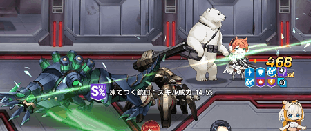 平時は待機しての運用がメインかと思いきや、待機せずともモードチェンジ状態ならスキル2にはバリア/被ダメ軽減解除効果があるので今回のようにHP5,6万の敵を薙ぎ払う程度なら運用上は問題ありません。