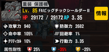 一方で属性耐性を持つFAビッグチックⅡ相手はかなり厳しく、重火器用照準器Ex+10で被ダメ軽減50%を無視しても30%の電気耐性に阻まれて3割減と極端に予ダメが落ちます……。