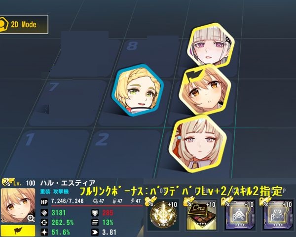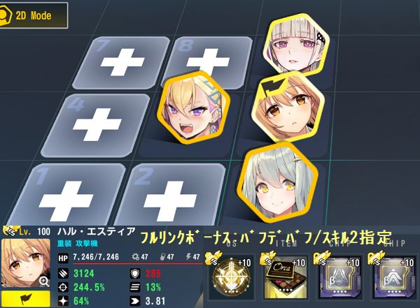 ハルのスキル2は中心→十字→四方と範囲が外にいくほどに火力が25%ずつ減衰するので、四隅に硬い敵がいるとどうしてもバッファー盛り盛りになります。