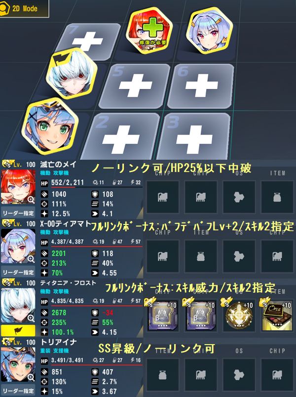 上のダーナ編成のダーナをノーリンクにして、SS昇級トリアイナを添えて開幕浸水を付与させただけです。