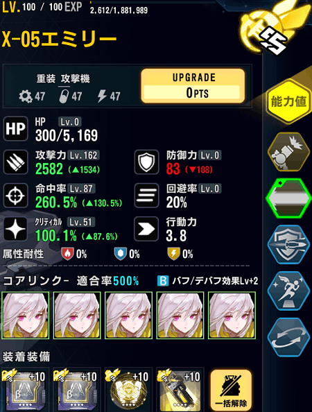 重装編成の時点でレモネードアルファを採用すれば味方重装に大幅加速ができますし、エミリーは敵の被ダメ軽減を解除できます。