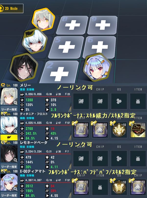 ・全てのキャラは一般的な育成完了状態、レベル100、スキルレベル10である