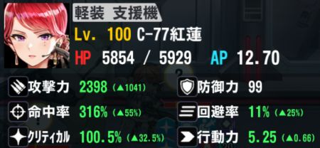 中破運用なのに自傷ダメを受けるという大きなデメリットがあるだけに増加値が凄まじく、スキルレベル12相当の今回は自己バフだけで攻撃値+77.5%も増加しているという。