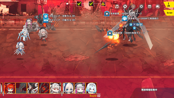 これによりHPが0になると普通に大破してしまう問題は、もはや攻撃1回目のRound終了時は装備効果で耐え、2回目の攻撃のRound終了時はRound終了より先に戦闘を終了させることで免れるようにしています。