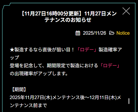 前回の製造追加キャラ、Aランク重装支援機のロデーの時はピックアップの文字があり効果も体感できたのになんと今回はこの一文がありません。