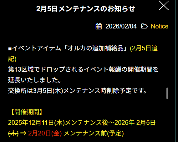 とはいえ26/02/05メンテで追加された新イベント"オルカのAGSよ!団結せよ!"は1か月開催のイベントでして、イベントステージも第1部のみという死ぬほどたいくt……ゆったり遊べる新規~初心者向けの期間のイベントですので、一日ズレたところであまり影響はないように思います。