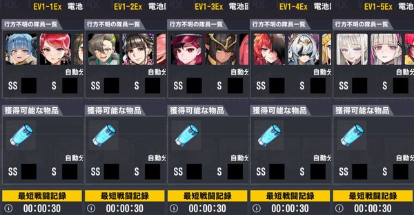 とはいえSSの2名(左上)はどちらもドロップ機会が13区域という最深部で、到達するためには始めたての方は多くのキャラの確保と育成、装備の獲得と装備強化、施設研究"精密分解施設Ⅴ"を目指し分解時の資源2.5倍化を目指さないとなどハードルがかなり高めで到達に時間がかかります。