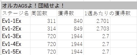 全ステージを自律戦闘(報酬1割減)で周回させて得た結果をスクショ、エクセルに記入してみたところ上記のようになりました。