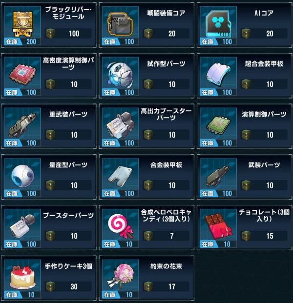 周回で集めるのが基本の品々。研究進行やロボ研究で不足気味な素材を交換しよう。